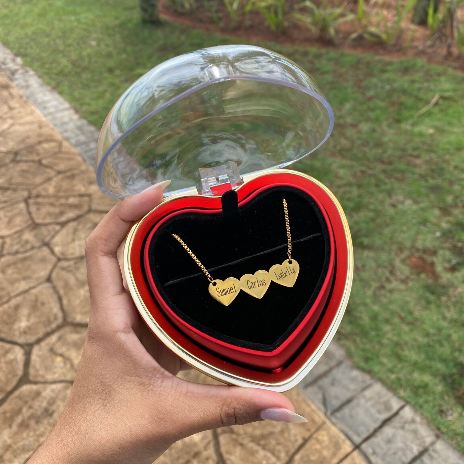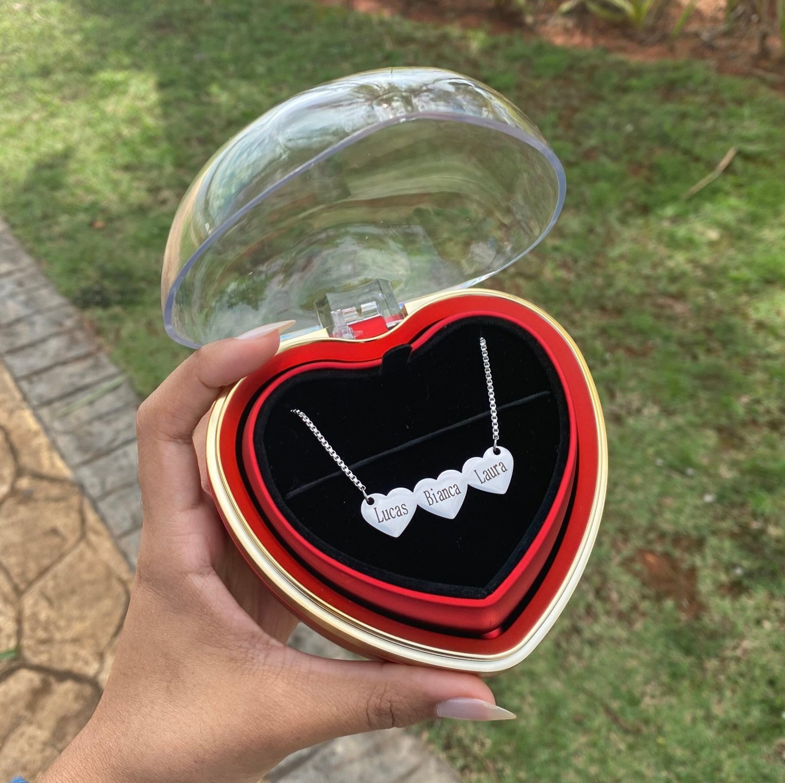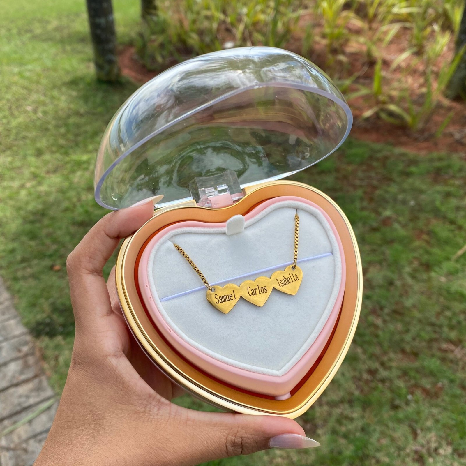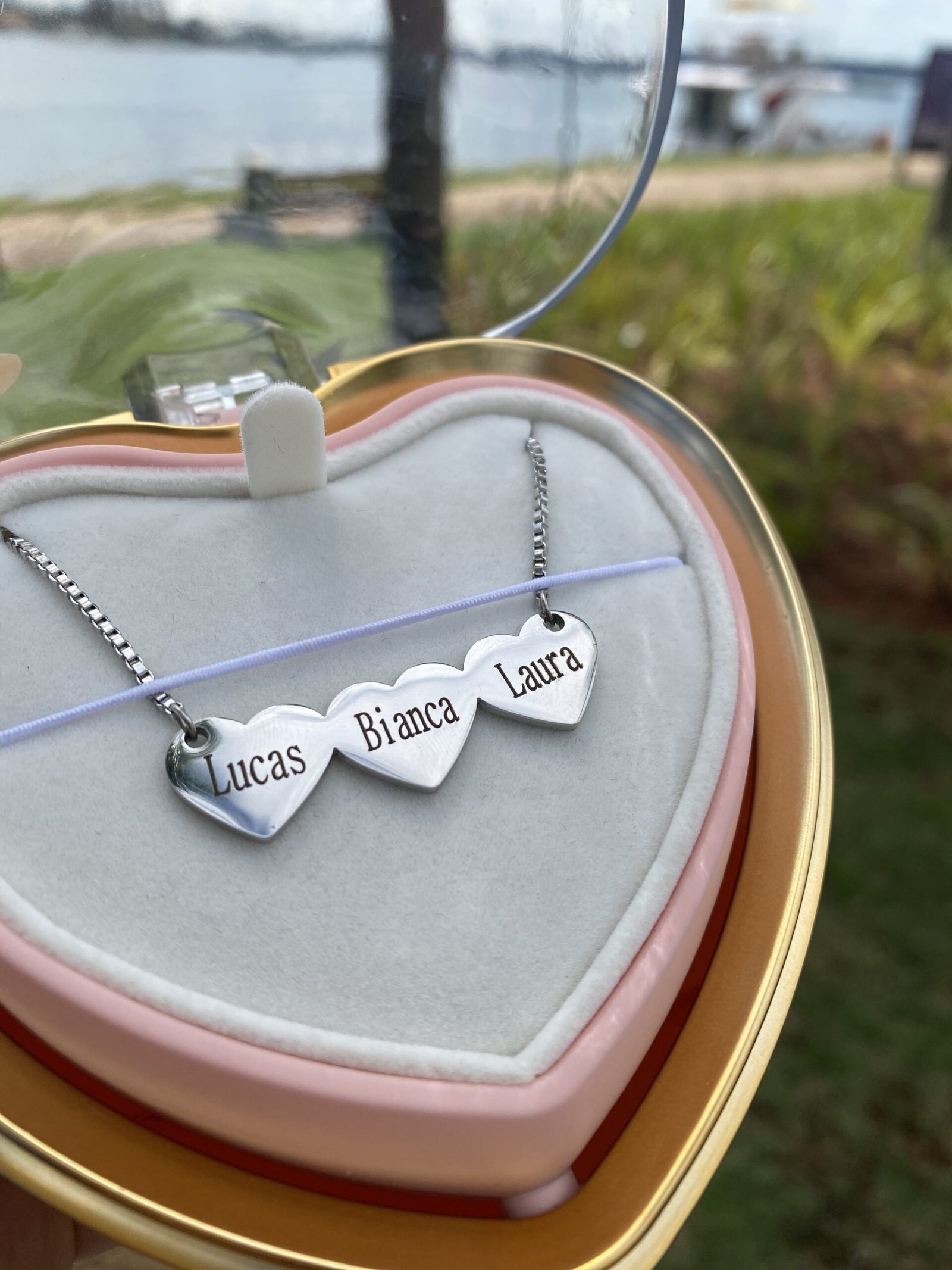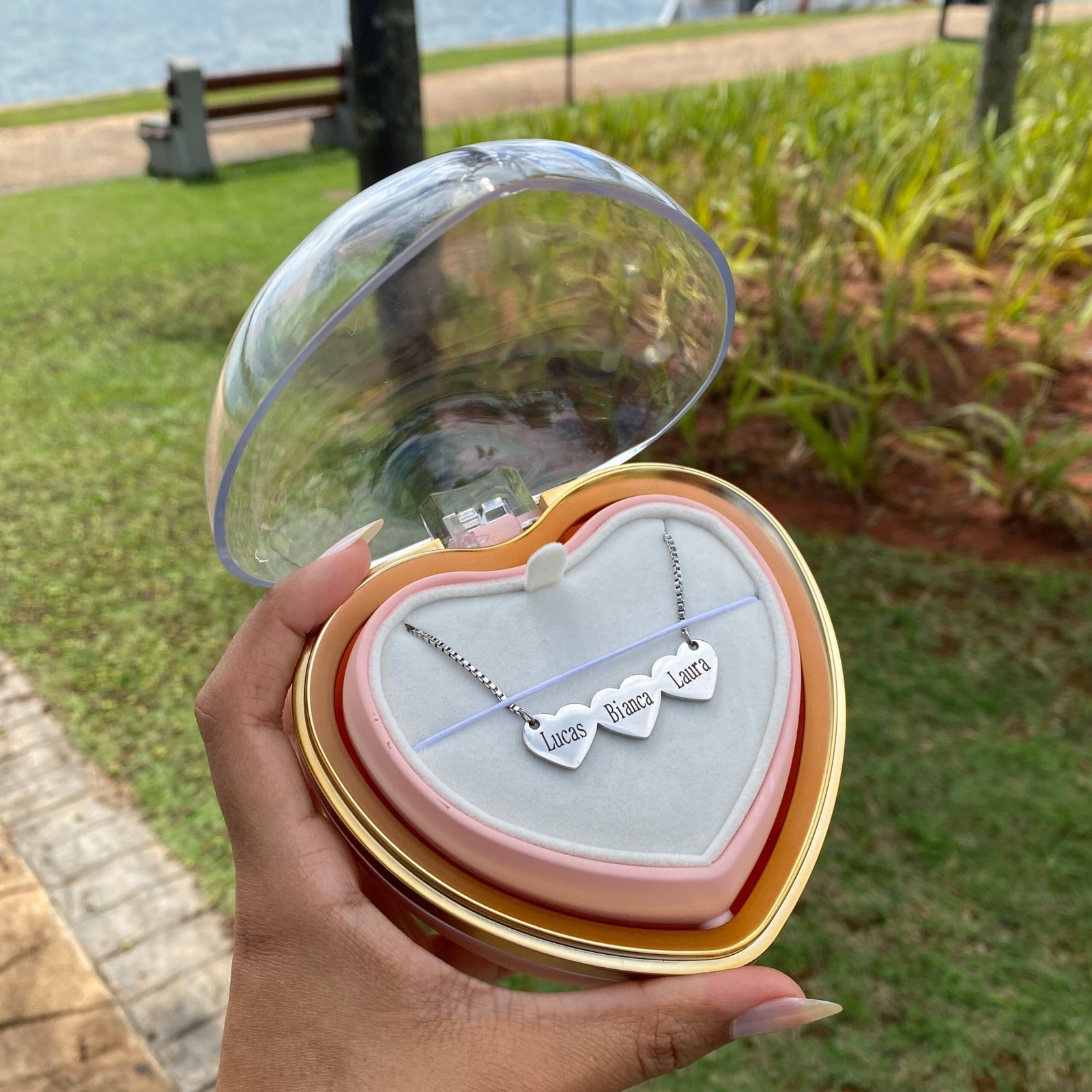 Ao abrir o porta-joia, a surpresa se revela. Dentro dele está um colar exclusivo, onde você pode adicionar de 1 até 5 corações personalizados com nomes, iniciais ou datas importantes. Cada coração representa alguém especial ou um momento marcante, tornando essa joia totalmente única e cheia de significado.